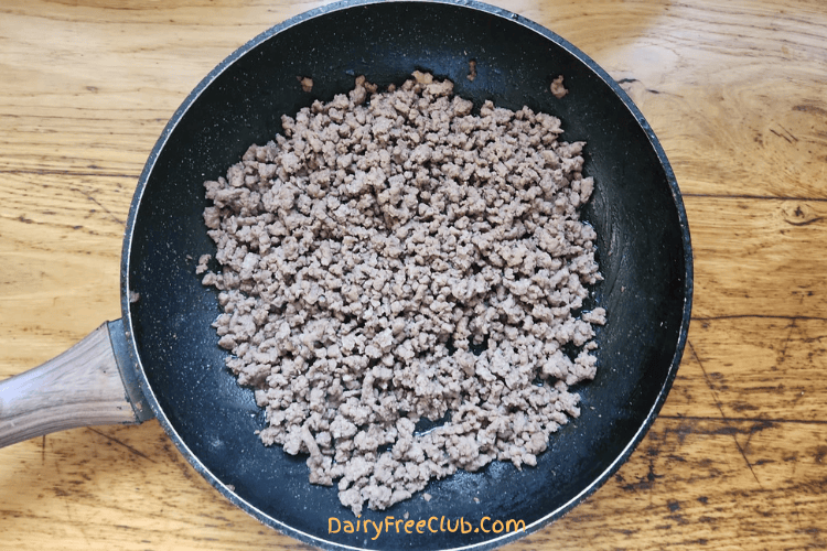 - Cook the ground beef in a nonstick pan, broken into small pieces.