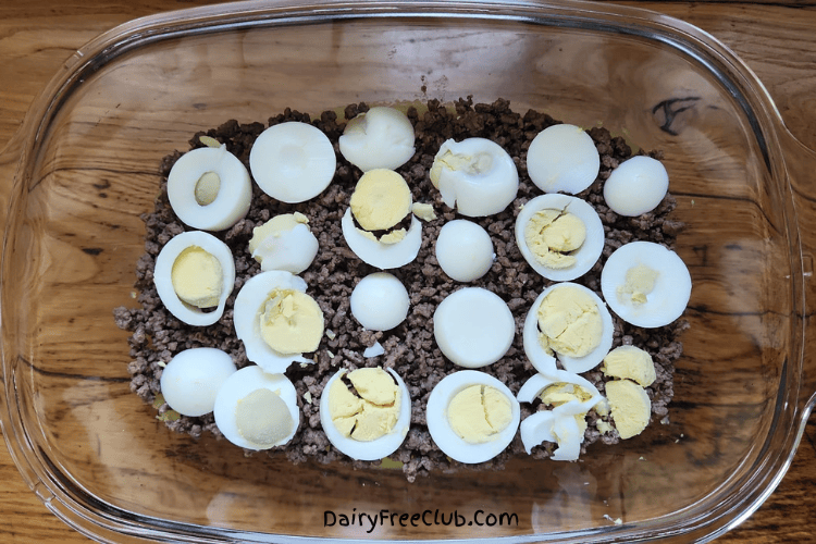 - Arrange the sliced hard-boiled eggs evenly over the meat.